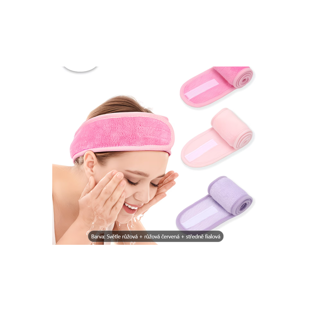 Kosmetická čelenka spolehlivě zafixuje vlasy a udrží je pryč z čela. V klidu můžete aplikovat make-up, pleťové masky, krém či provést odlíčení pleti a nestarat se o překážející vlasy na tváři. Čelenka se suchým zipem je nastavitelná na každý tvar obličeje.Barva: Světle růžová + růžová červená + středně fialová
