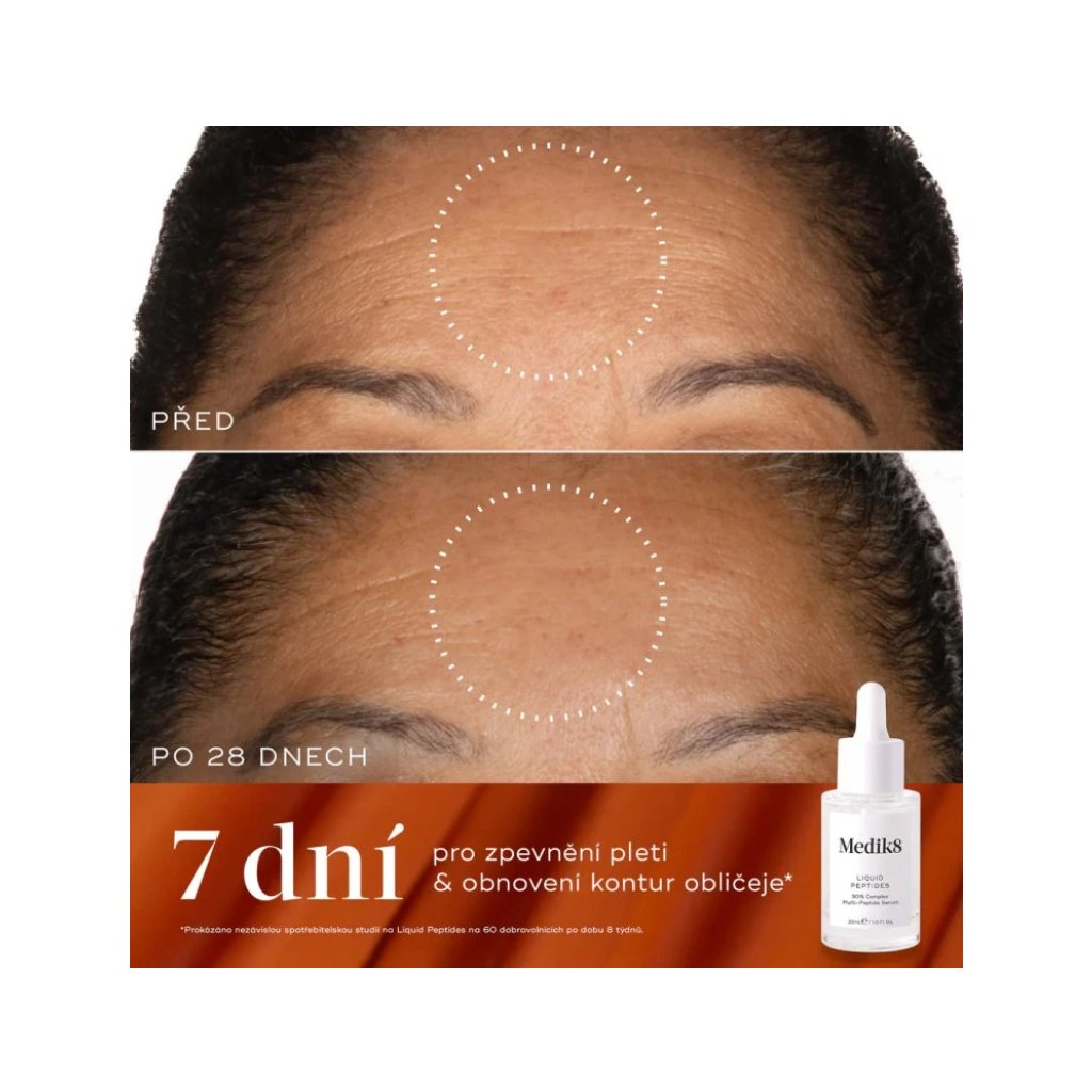 Medik8 proto vytvořil Liquid Peptides s unikátní směsí 10 různých peptidů v 30% koncentraci, které využívají cílenou „drone“ technologii, zajišťující, že každá účinná složka pronikne přesně tam, kde ji pokožka nejvíce potřebuje – pro maximálně omlazující efekt.